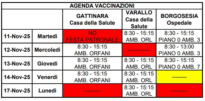 Per garantire la vaccinazione antinfluenzale ai pazienti attualmente privi del medico curante, l’ASL VC ha attivato delle giornate vaccinali straordinarie tra l’11 e il 17 novembre, presso la Casa della Salute di Gattinara, la Casa della Salute di Varallo e l’ospedale di Borgosesia.