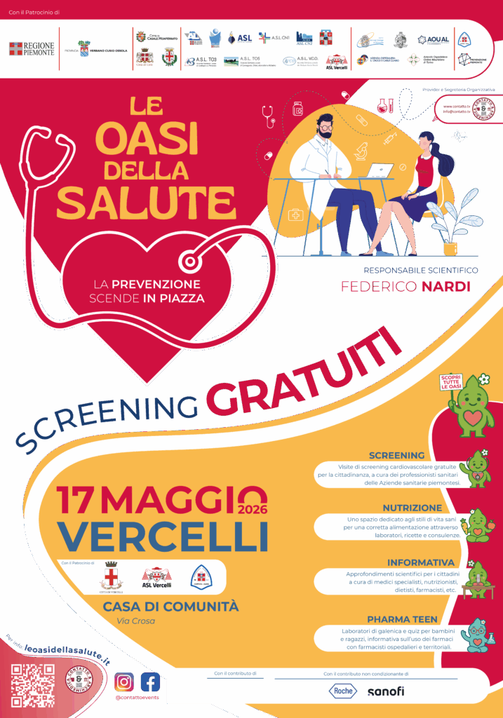 L’appuntamento è di quelli da segnare in rosso sul calendario: DOMENICA 17 MAGGIO in 15 piazze piemontesi arrivano “LE OASI DELLA SALUTE”, una giornata di screening cardiovascolare aperta a tutti e completamente gratuita. L’iniziativa nasce dalla volontà dell’Assessorato alla Sanità della Regione Piemonte e vede la firma come Responsabile scientifico del Dott. Federico Nardi, Direttore della Cardiologia dell’Ospedale Santo Spirito di Casale Monferrato e Direttore del Dipartimento Medico ASL Alessandria.
