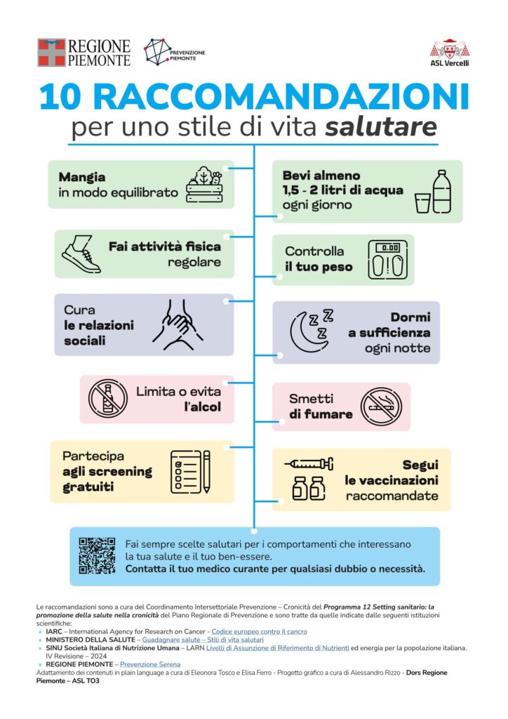 La Regione Piemonte, nell’ambito del Piano Regionale di Prevenzione 2020-2025, promuove la campagna informativa “10 Raccomandazioni per uno stile di vita salutare – Per mantenerti in buona salute fisica, mentale e relazionale”, volta a sensibilizzare sui comportamenti da adottare per mantenere una buona salute fisica, mentale e relazionale in un’ottica di promozione della salute, intesa come “processo che consente alle persone di esercitare un maggiore controllo sulla propria salute e di migliorarla» (Carta di Ottawa, 1986).